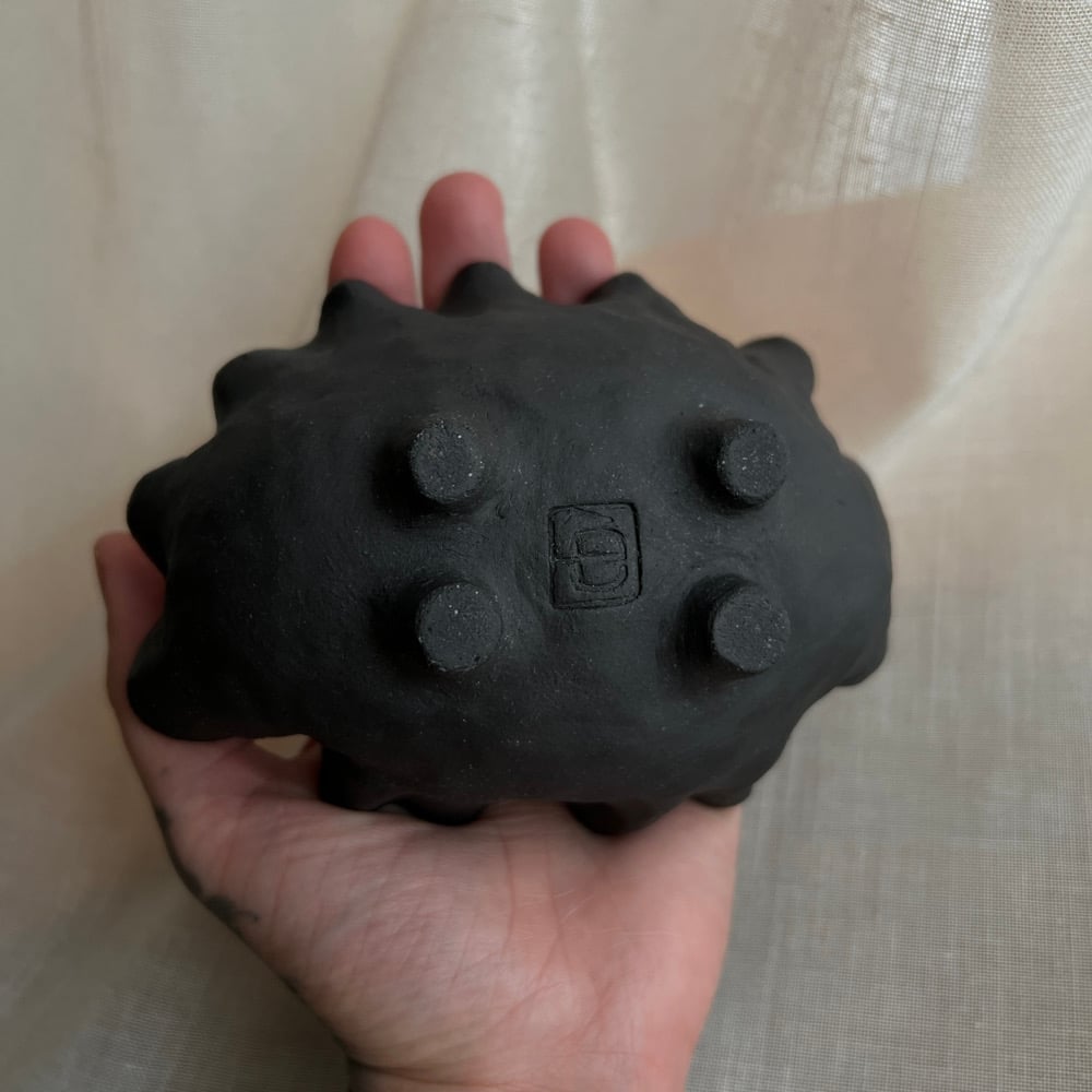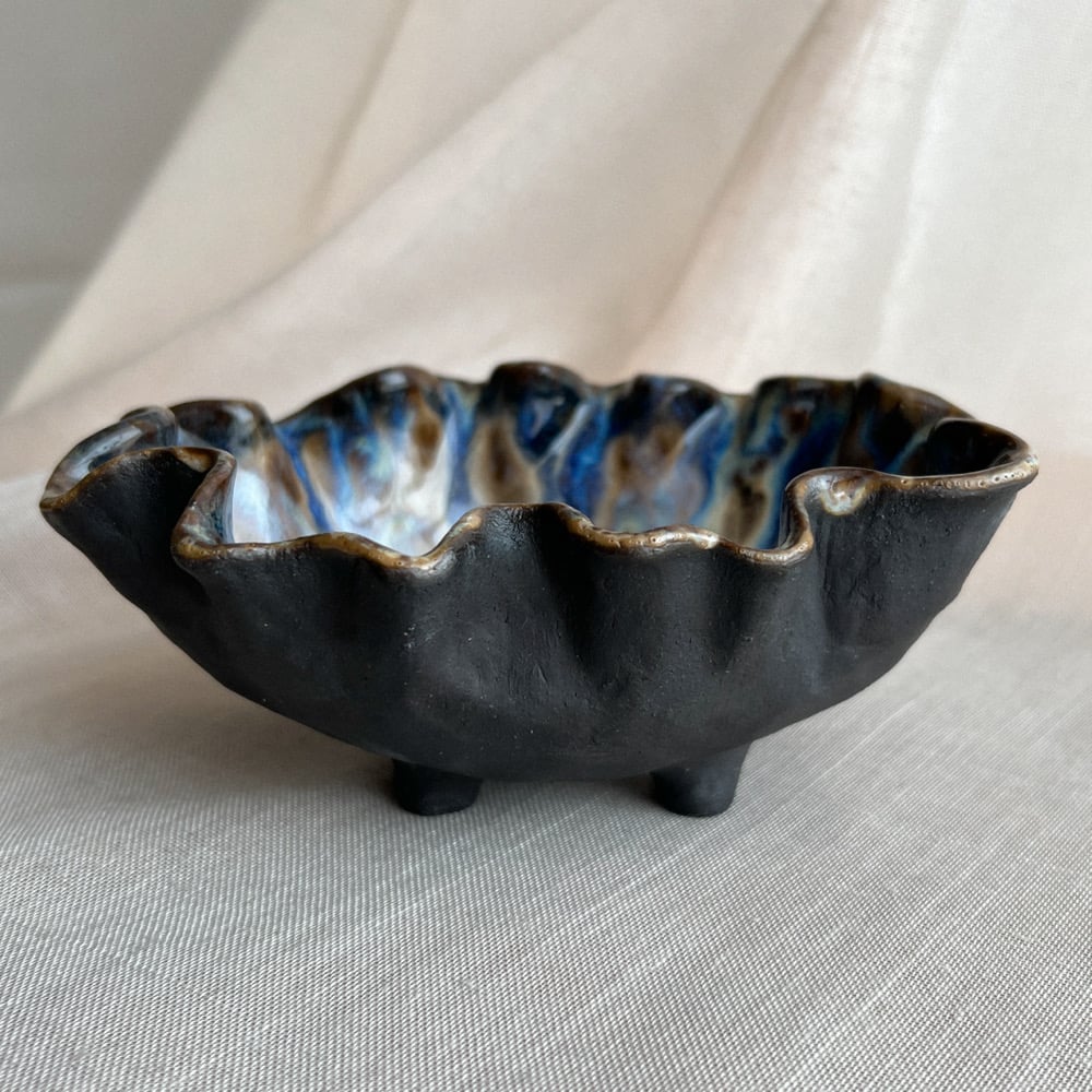 Curly bowl made of black rough stoneware, the outside is left unglazed while the inside has a beautiful flow of glossy glaze.