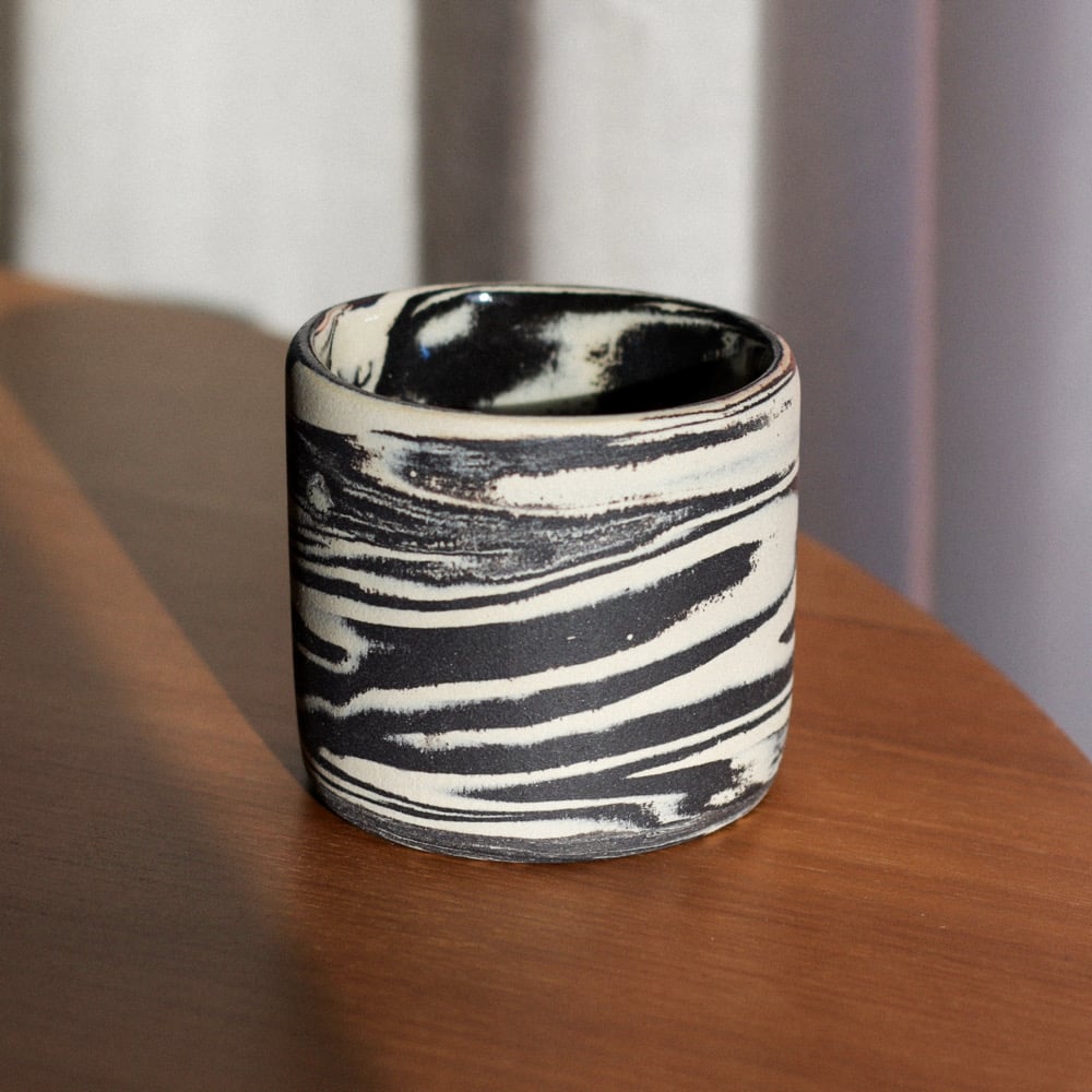 Die Tasse Marmi wird in reiner Handarbeit aus zwei verschiedenen Steingut-Tonen hergestellt, um einen schönen Marmoreffekt zu erzielen. Jede Oberfläche wird von Hand poliert und nur auf der Innenseite glasiert. Die Außenseite dieser Tasse ist unglasiert, um eine matte Steinoberfläche zu erhalten. Diese Tasse ist ideal für Cafe latte oder Matcha.