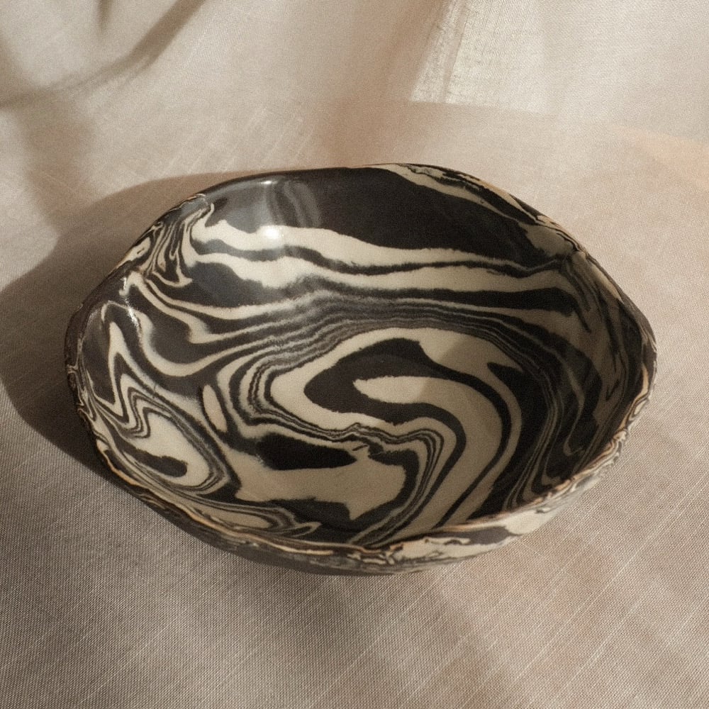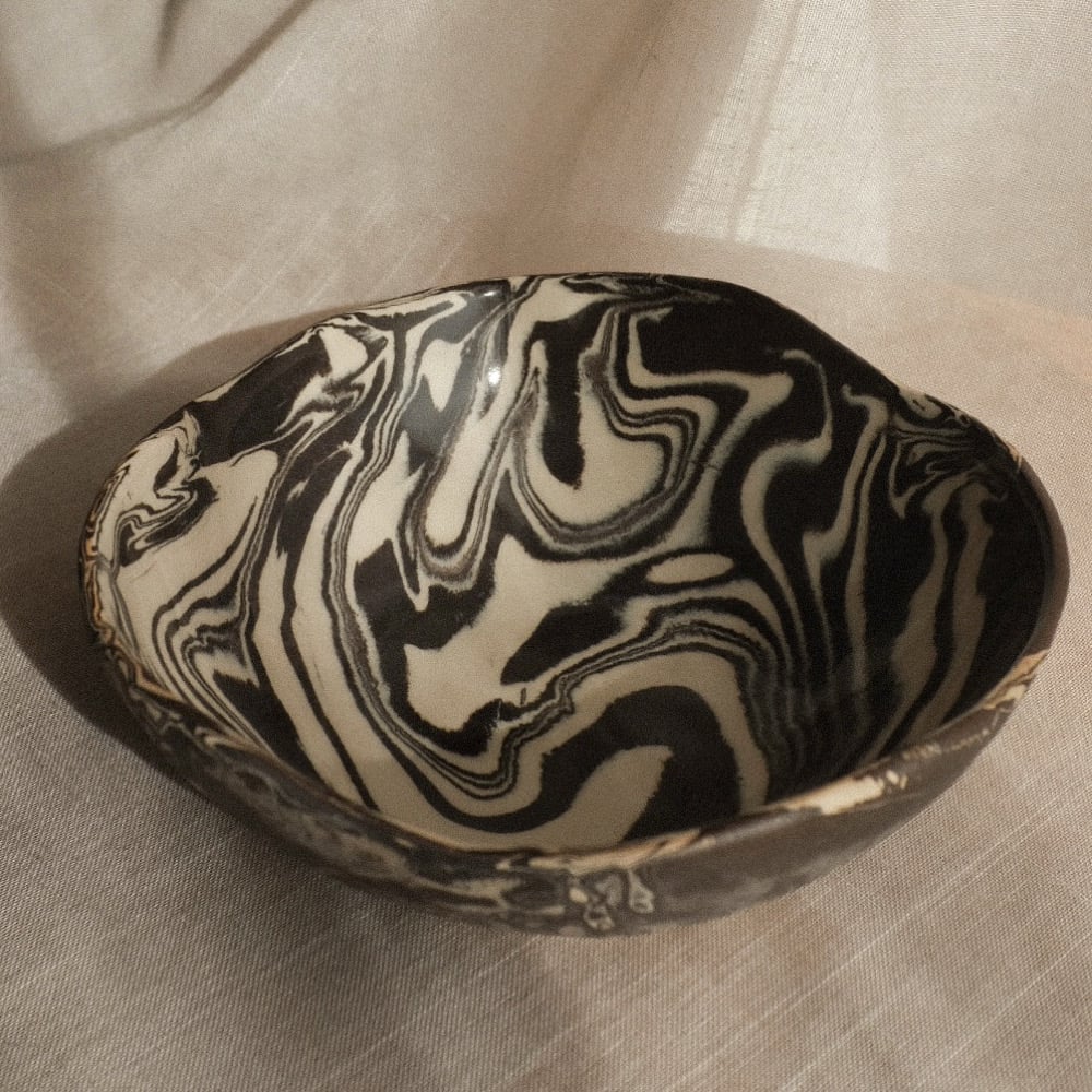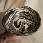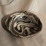 Medium bowl made of white and dark brown stoneware clay, glazed only on the inside, while the outside is left unglazed.