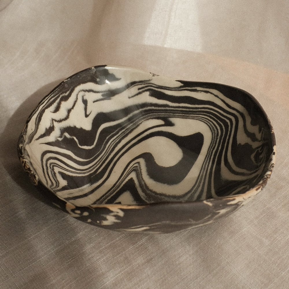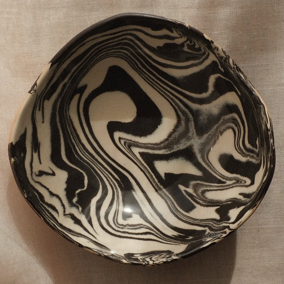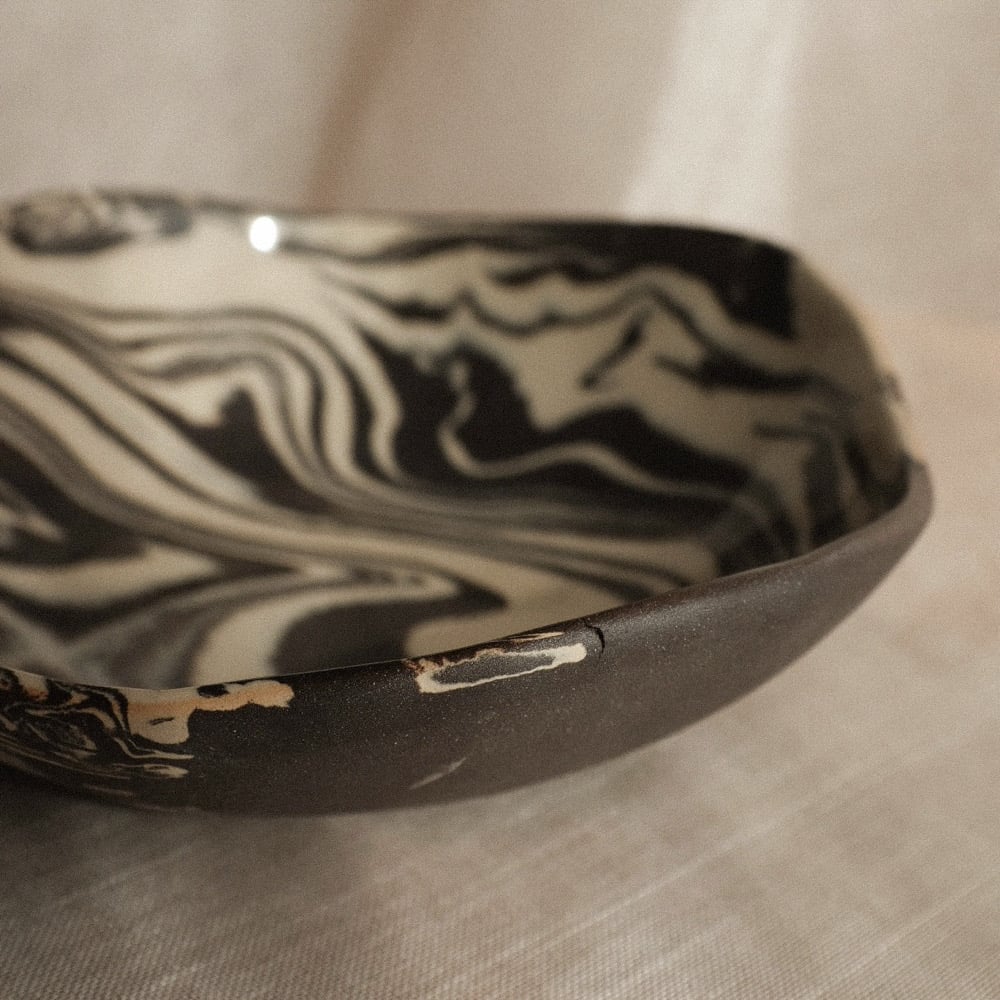 Medium bowl made of white and dark brown stoneware clay, glazed only on the inside, while the outside is left unglazed.