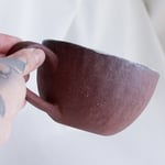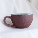 Diese Tasse wurde aus rotem Steingut von Hand gefertigt und mit einer weißen Sprenkelfarbe glasiert. Die Oberfläche ist rau und rustikal.