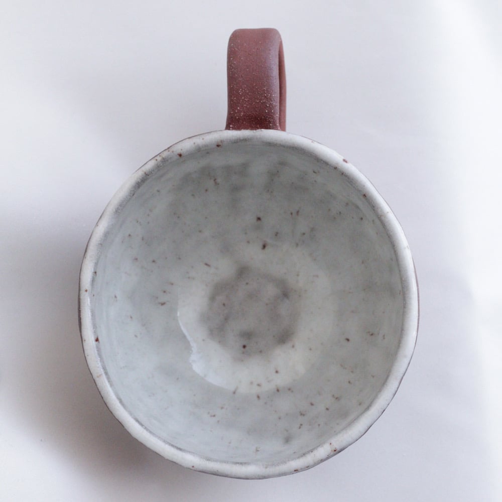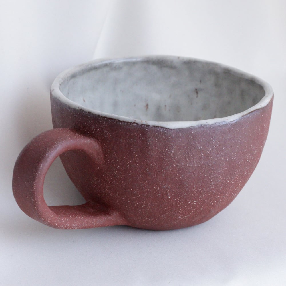 This cup is hand built of red stoneware clay and glazed with a white speckle glaze. The finish is rough and rustic.