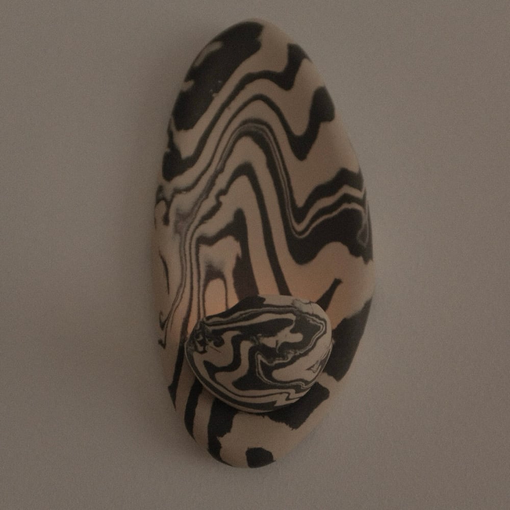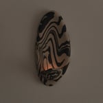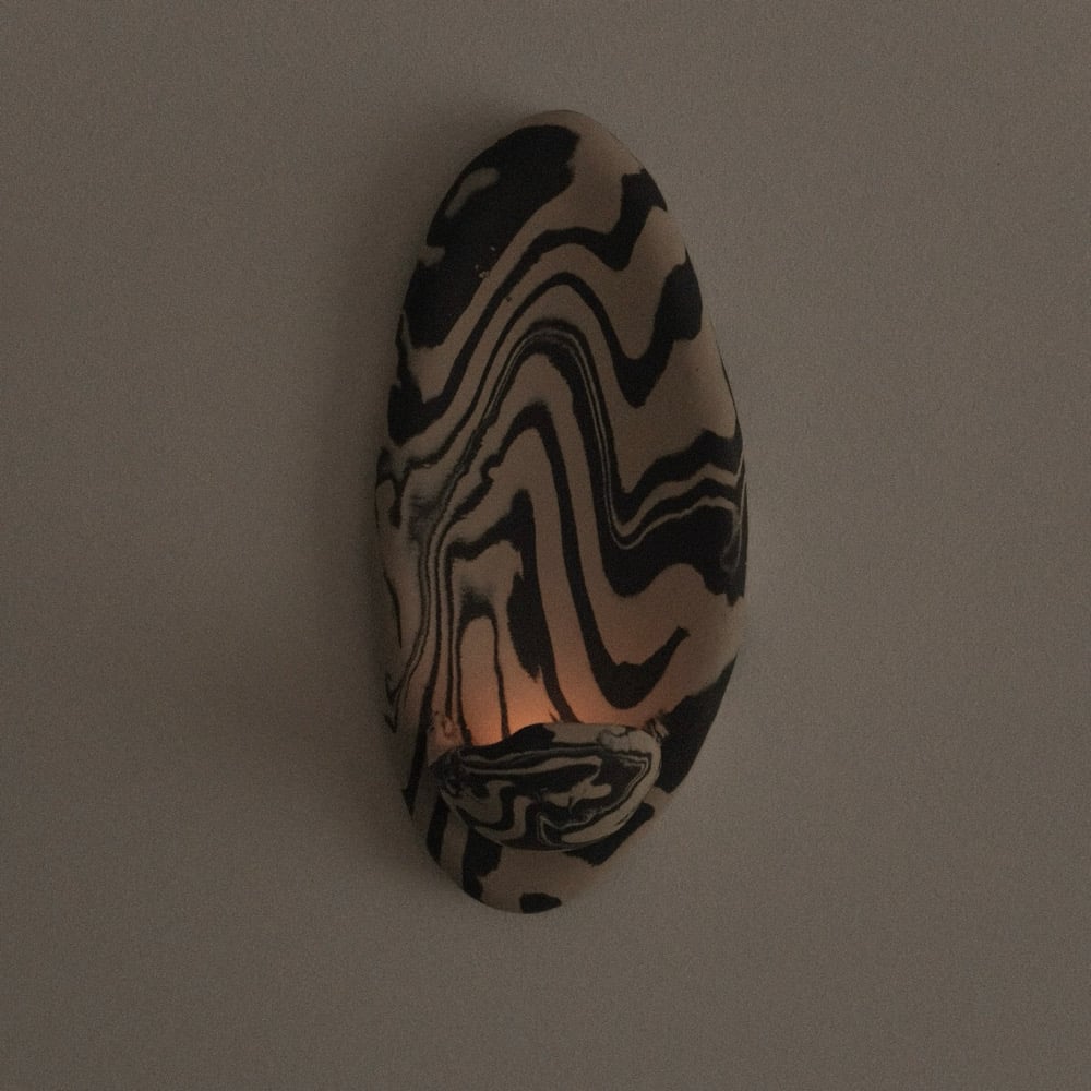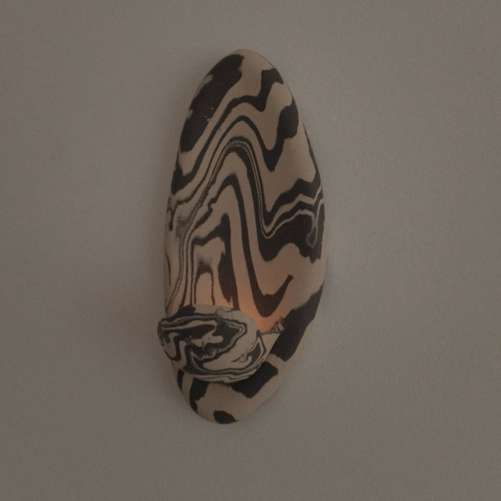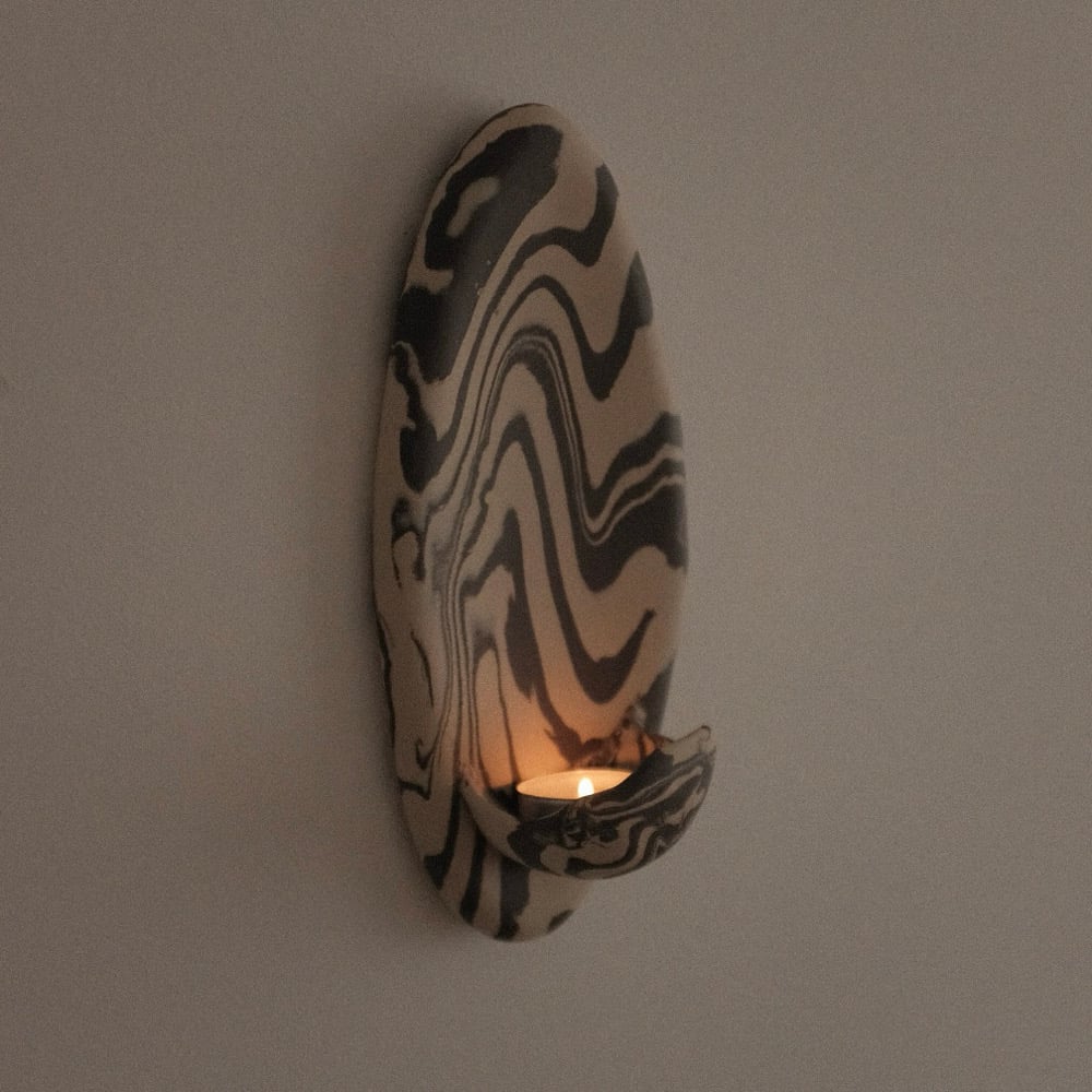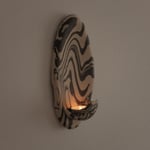 Wall hanging candle holder made of white and dark brown clay. It is shaped with a soft rounded edgde and fits a tealight candle to give a cosy accent to the space.