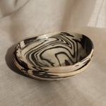A set of two small bowls made of white and dark brown stoneware clay. They are glazed on the inside, while the outside is left unglazed, then fired to 1230ºC