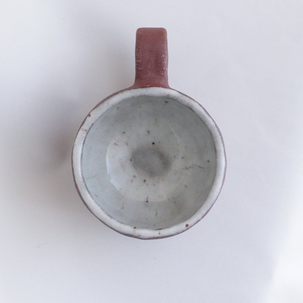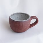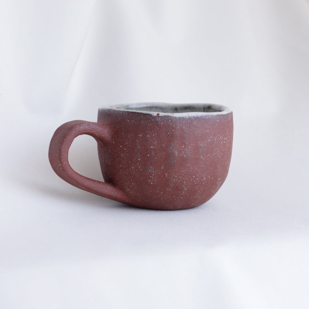 Diese kleine Tasse ist aus rotem Steingut handgefertigt und mit einer weißen Sprenkelfarbe glasiert. Die Oberfläche ist rau und rustikal.